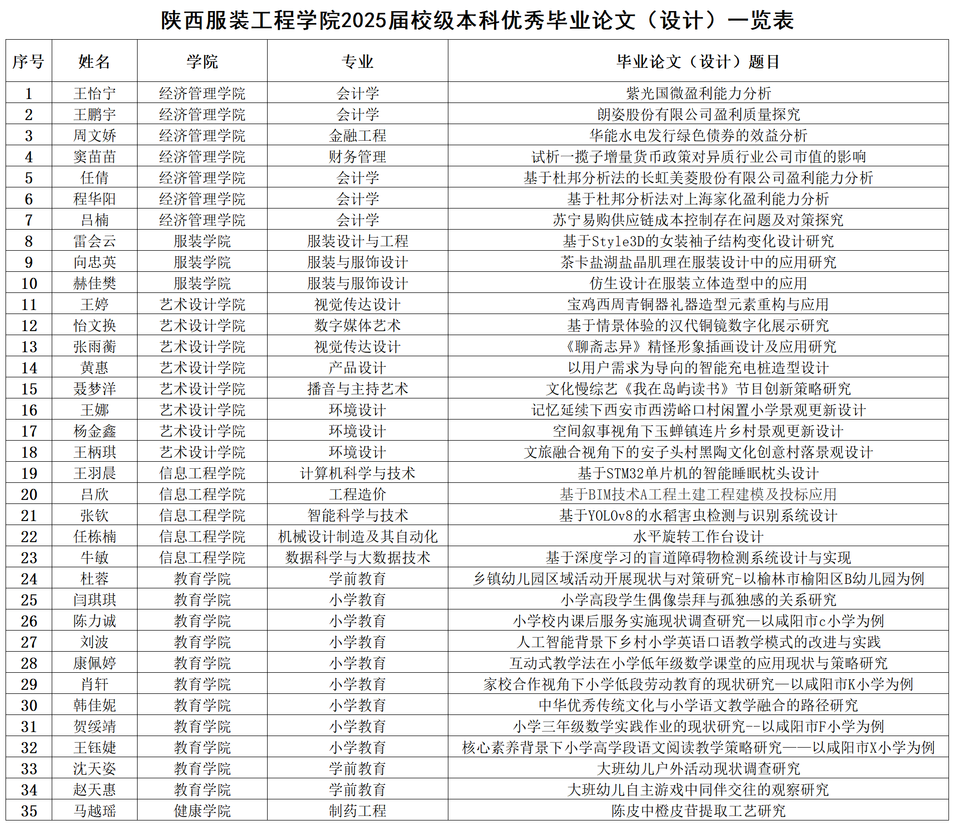 根据《Bwin必赢网站本科毕业论文(设计)管理办法(修订)》(陕服院发〔2022〕156号)及《关于2025届本科毕业论文(设计)后期工作安排的通知》(陕服教函发〔2025〕66号)文件要求,按照公平、公正、公开原则,经各学院初评推荐、论文检测审查、Bwin·必赢体育审定等环节,共评选出2025届校级本科优秀毕业论文(设计)35篇。现将结果予以公示(见附件),公示期为2026年1月15日至1月17日。如有异议,请以书面形式反馈至Bwin·必赢体育实践科,逾期不予受理。